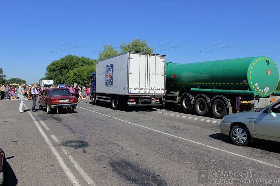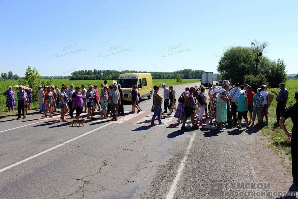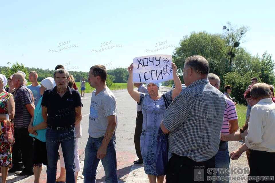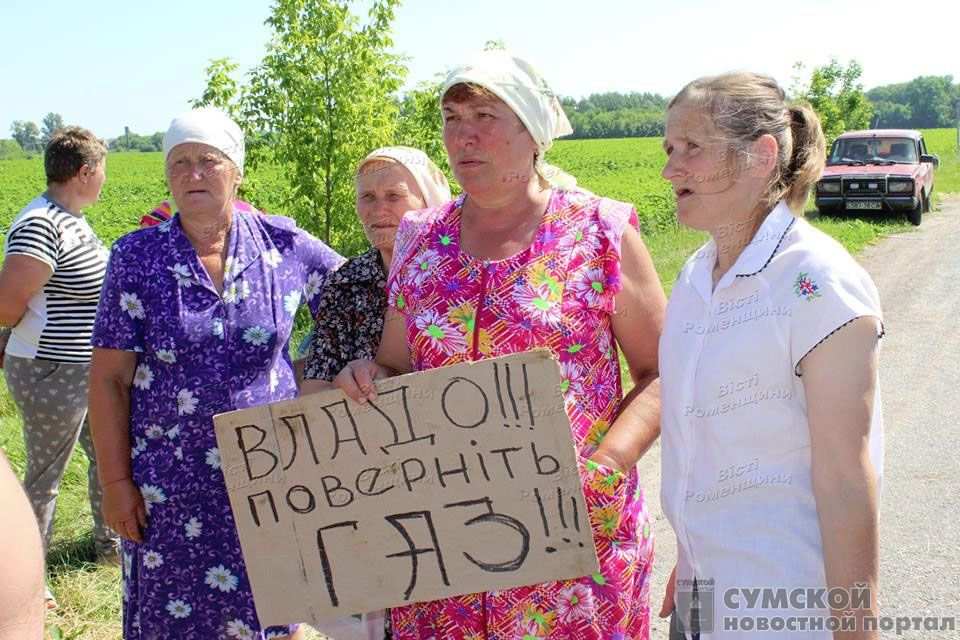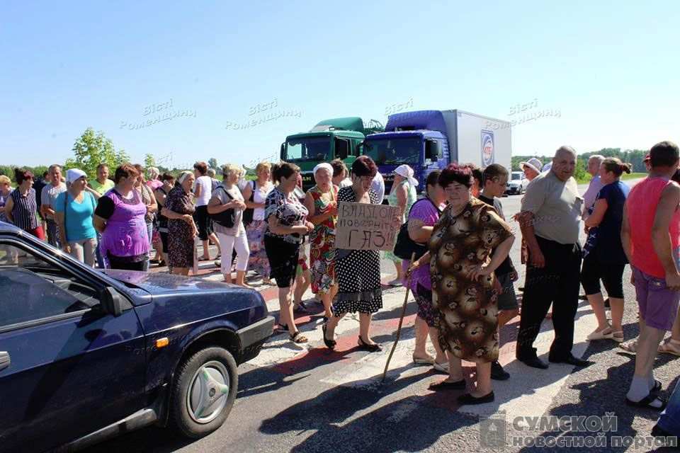Возмущенные жители организовали беспрерывное пешеходное движение через дорогу с плакатами «Власть! Верните газ!», «Хочу есть!» и закончили акцию только после того, как к ним приехали представители районной власти и пообещали 30 июня провести внеочередную сессию Роменского районного совета, на которой рассмотрят вопрос прекращения газоснабжения и что с этим делать. В общей сложности блокирование дороги продлилось около часа.