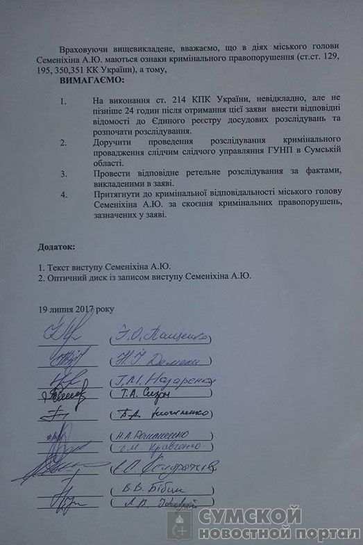 Одновременно с этим избранники подали подписанное 20 депутатами заявление в областную прокуратуру и ГУ НП в Сумской области об угрозах физической расправой депутатам исходящей со стороны мэра Конотопа.