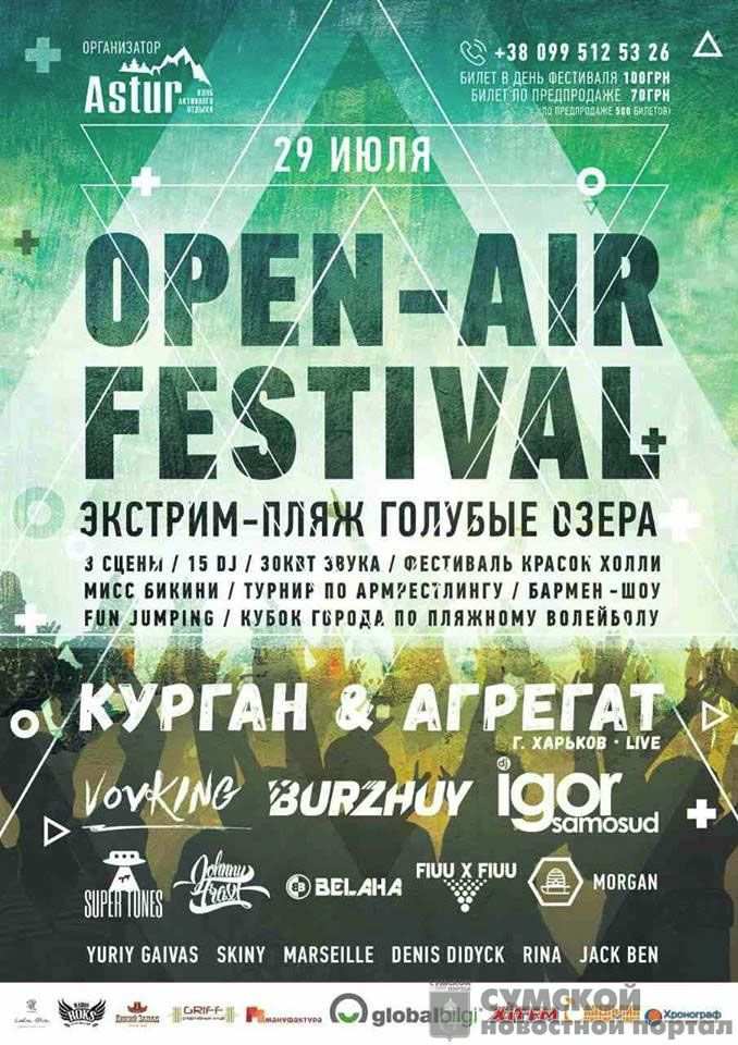 29 июля в г.Сумы на экстрим пляже «Голубые озера» состоится музыкальный фестиваль Sumy Open Air Festival. На пляже будет установлены три сцены для выступления более пятнадцати местных и приезжих ДиДжеев. Основными участниками выступающими фестиваля будут Dj Burzhuy (г. Киев), Dj Vovking (г. Киев), Dj Igor Samosud (г. Киев), Dj Super Tunes (г.Киев), Курган и Агрегат (г. Харьков), а также более десяти лучших Диджеев г.Сумы. Также состоится музыкальный батл между командами ВУЗов, состоящими из двух человек – ДиДжея и ЭмСи. Победителей батла выберут зрители. Организаторы обещают много звука – 30 кВт.