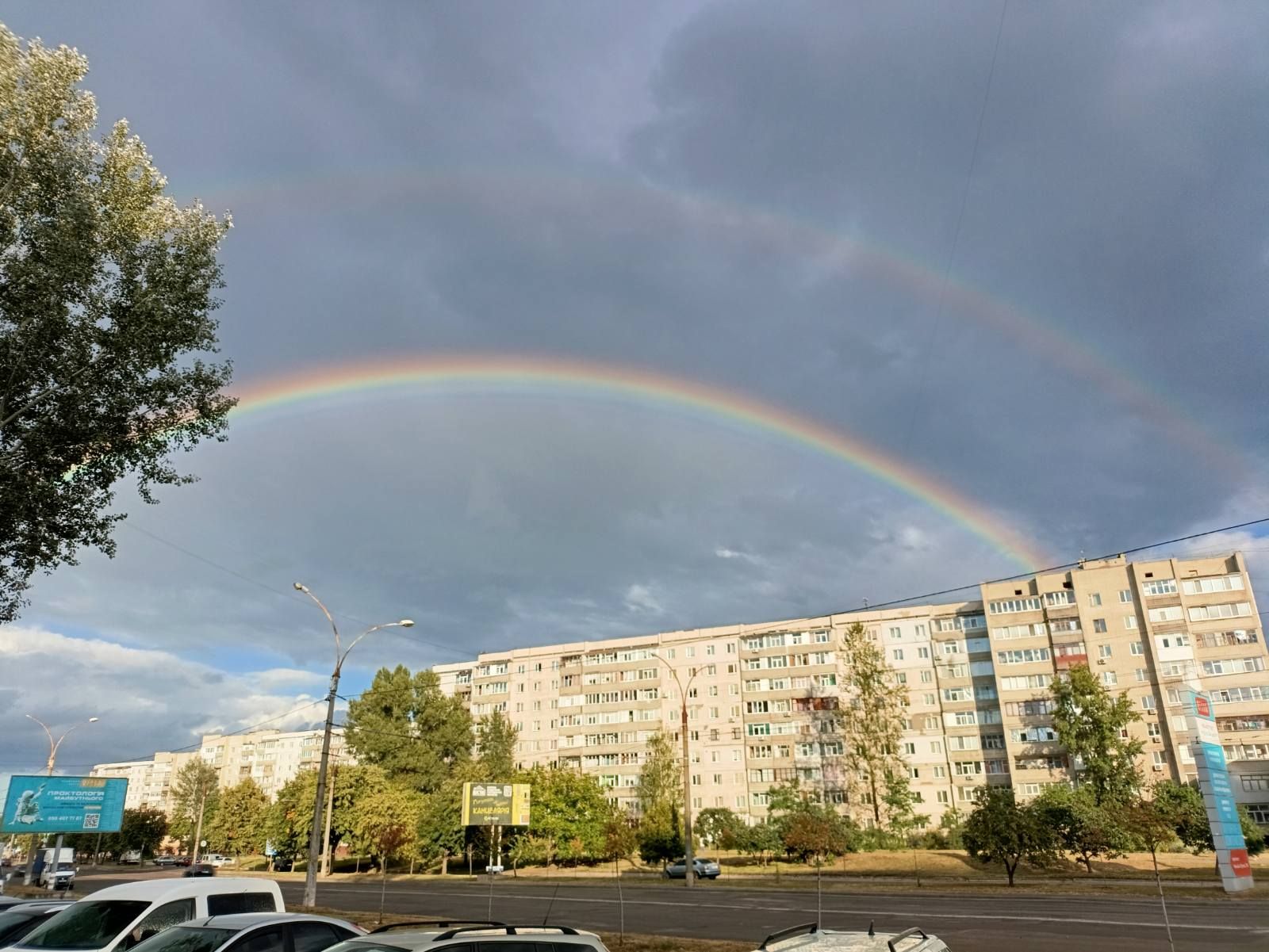 Всего несколько минут, очень четко было видно над городом (особенно в районе 12-го микрорайона в 18:05 — 18:10) двойную радугу ярких неоновых цветов.