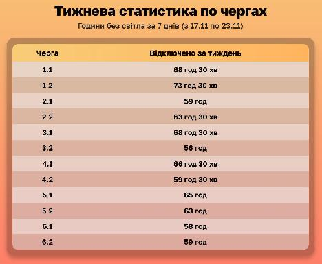 Телеграм-ресурс “Світло Суми” не полінувався і підрахував, скільки без електроенергії перебували споживачі кожної з “черг” в обласному центрі за минулий тиждень.